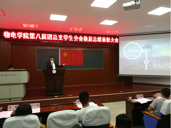 大会开始,孙亚辉书记进行了致辞,他对物电学院第八届团学分会的全体成员表示了感谢,同时也对新一届的团学分会成员寄予了希望,提出了新的要求。随后各部门通过ppt的形式对过去一学年的工作进行了汇报,并对优秀的干部干事进行了表彰。第八届团学分会主席李泽鹏和团总支学生副书记黄欢做了工作总结发言。表示在团学的这一年,让他得到了成长与历练,同时他也对未来的物电团学给予了殷切的祝福。感谢第八届物电团学的各个部门一年来的付出,希望新一届的委员会能带着这一份责任继续为物电学院学生和教师服务。在新一届主席的带领下,第九届团学分会全体委员向着团旗进行了庄严的宣誓。