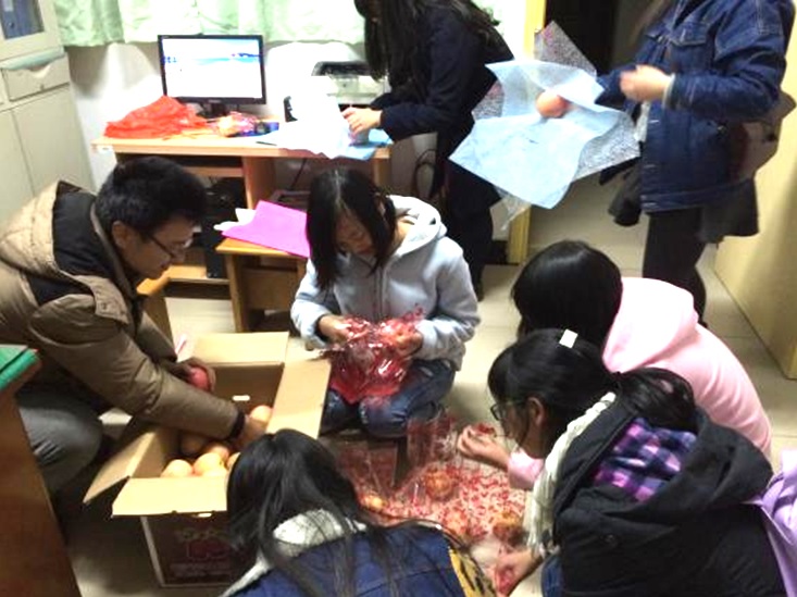 2014年12月24日平安夜,物电学院的考研学子们埋头在书山题海中做最后的冲刺。完全忘记了今天是年轻人们喜爱的圣诞节平安夜。为了鼓励考研学子追逐梦想,物电学院党政领导十分关心考研学生,发起了这次平安夜送“平安果”活动。就业专干何小娅老师和学生干部们一起精心挑选“平安果”,写上老师的祝福语。来到6号教学楼301考研自习室为他们加油打气。满满的祝福和关爱,助力青春的梦想。一直以来我院学生考研工作开展扎实有效,院领导十分重视,从一年级的考研讲座,到三年级的考研动员,到四年级考研学生的指导都有分管教学的罗院长亲自抓手。近四年来平均录取率达到了22.7%,全校排名前三,且每年都有很多学子考取全国名校,2014届共有21人录取研究生,其中211高校录取率达80.95%,居全校第一。今年共计研究生报考人数达到68人,报考率41.46%,居全校第一。12月27、28日是今年的考研日。在战役打响的前期,在这个青年学子们欢快的日子里祝福同学们再创佳绩,实现梦想。