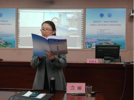下午1:30,本次论坛成果展示活动开始。成果展示分为两部分,一是优秀自制教具展评,二是优秀论文展评,来自西南大学、湖南师范大学、湖南科技大学、湖南工业大学和WilliamHill中文官方网站的14位(组)研究生以线上、线下相结合的形式展示了他们的研究成果,WilliamHill中文官方网站李科敏教授和岳阳市教育科学研究院的袁丽老师分别为优秀自制教具、优秀论文逐一做了精彩的点评。