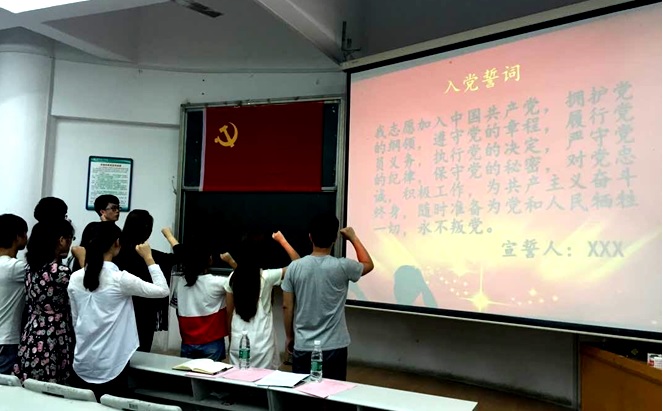 在雄壮的国歌中大会拉开帷幕。宣读党员批复后,本批发展党员面向党旗宣誓,宣誓仪式是对党员进行教育的重要环节,每一位新党员用自己激情澎湃诚挚的声音许下入党的誓言。