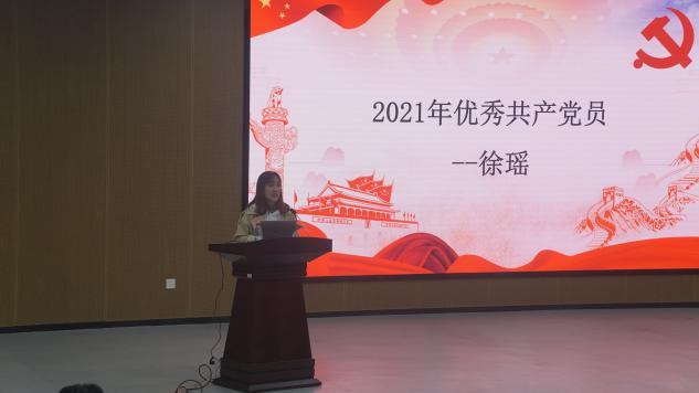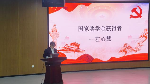 优秀党员代表、国家奖学金获得者左心慧借用影剧《觉醒年代》来向革命先烈们致敬。她将共产党员比作一盏明灯,一盏照亮自己、指引身边人的明灯,并提出:作为青年的我们不应该只活在先辈的余荫下,而应扛起未来的大旗,在学习道路上下真功夫、苦功夫、辛功夫,不忘初心,牢记使命。