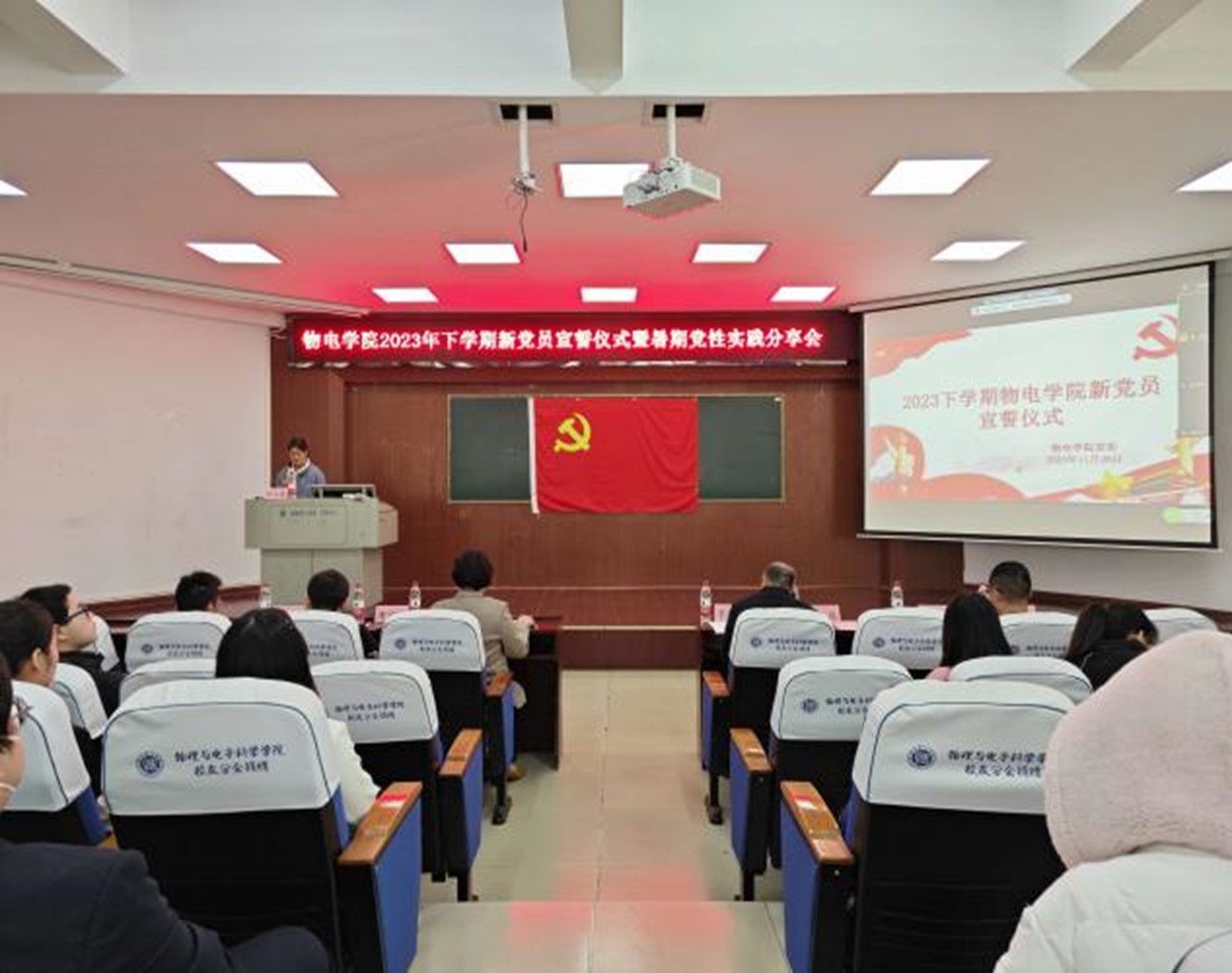 11月28日下午,物电学院2023年下学期新党员宣誓仪式在6号楼学术报告厅隆重举行。学院院党委成员周畅、李宏民、李科敏、魏勇、邹志军出席,全体学生党员和入党积极分子参加,学生党支部书记何小娅主持。