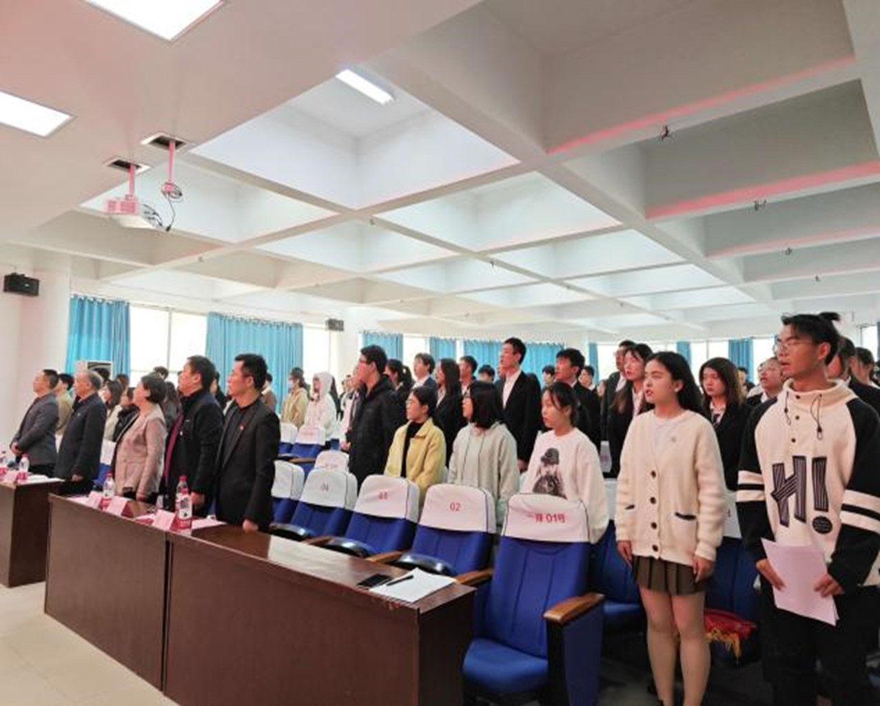 仪式在庄严肃穆的《国际歌》中拉开序幕。李科敏宣读预备党员名单,随后院党委委员为预备党员佩戴党徽,发放《中国共产党章程》。