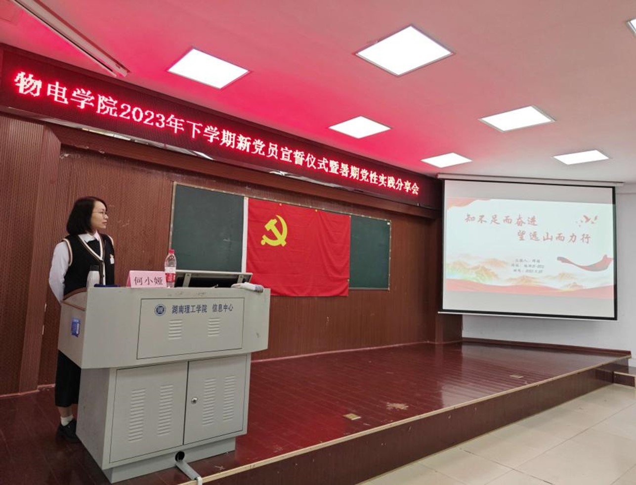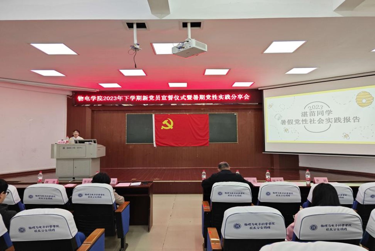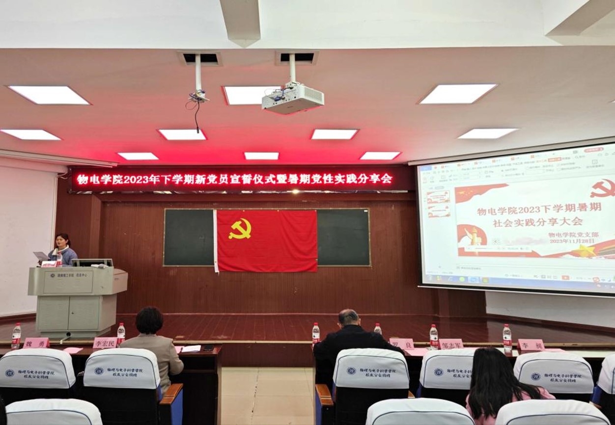 2023年11月28日下午,物电学院党委在6号楼学术报告厅召开2023暑期党性实践分享会。院党委书记周畅、党委副书记李科敏出席,学生党员和入党积极分子100多人参加,学生党支部书记何小娅主持。