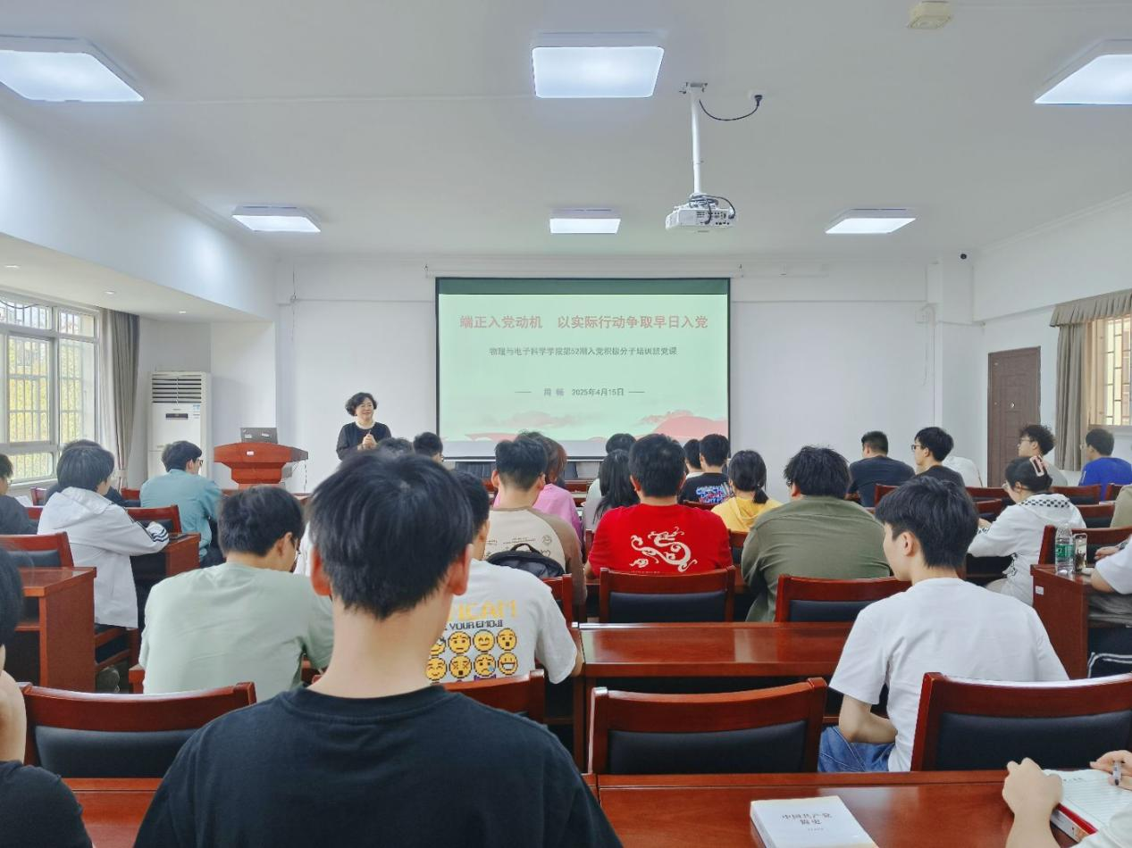 4月15日下午,物电学院党委书记周畅为第52期入党积极分子讲授题为“端正入党动机 以实际行动争取早日入党”的党课,52期学员参加学习。