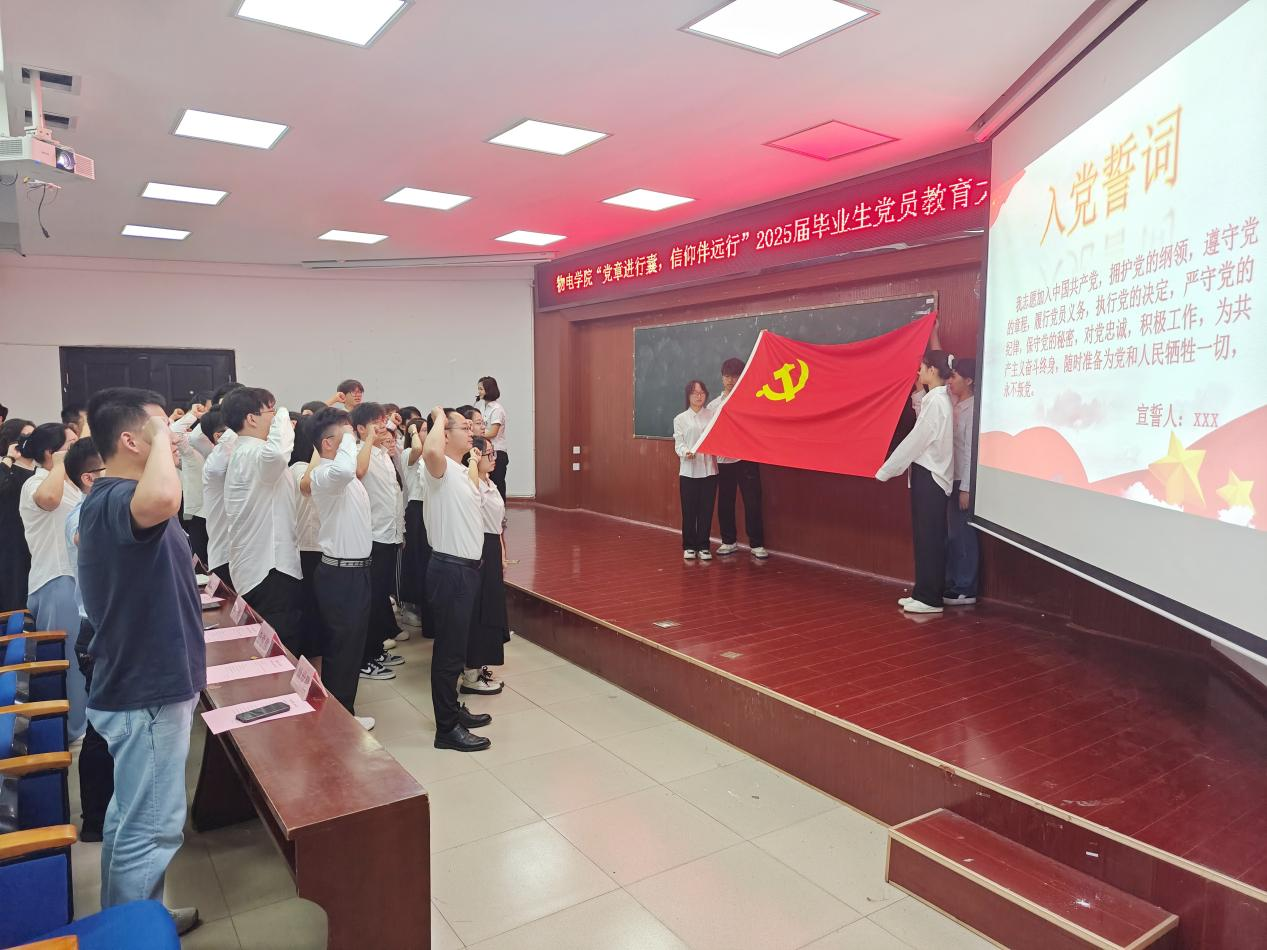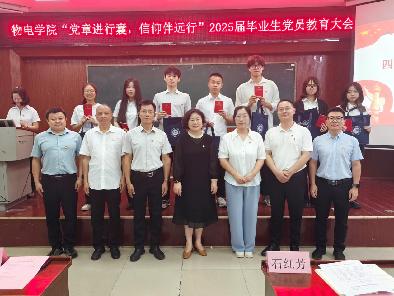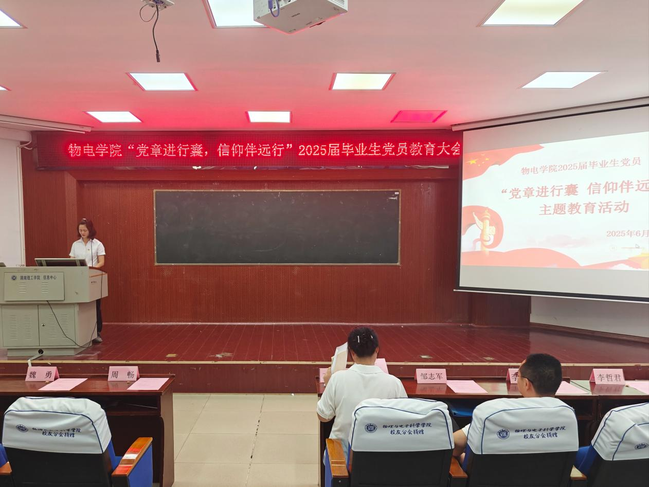 6月3日下午,物电学院召开“党章进行囊,信仰伴远行”2025届毕业生党员教育大会。学院党委委员、支部书记出席。全体学生党员及入党积极分子、学理论示范班和学理论示范寝室学员参加。何小娅主持。