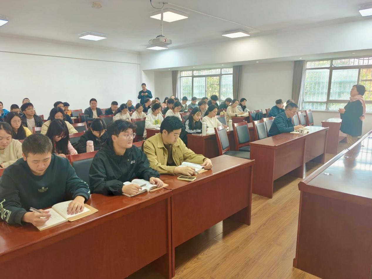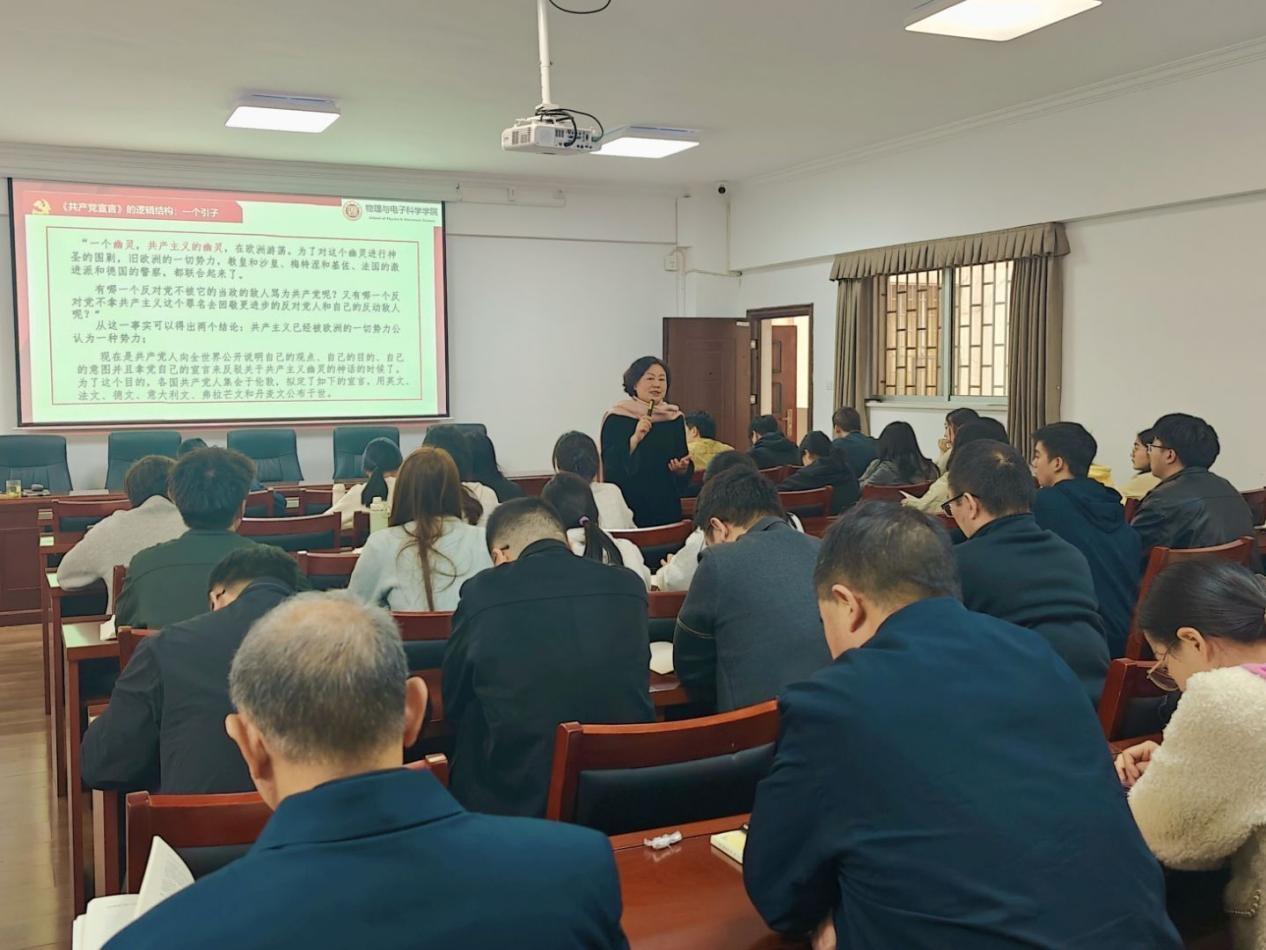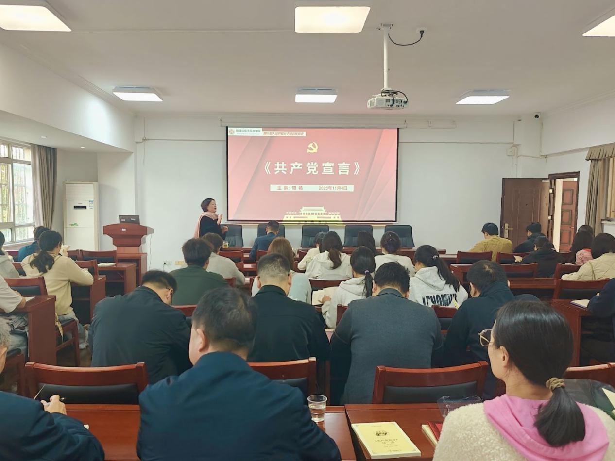 11月4日下午,物电学院党委书记周畅在6211会议室给全员教师党员和53期入党积极分子讲授《共产党宣言》专题党课。