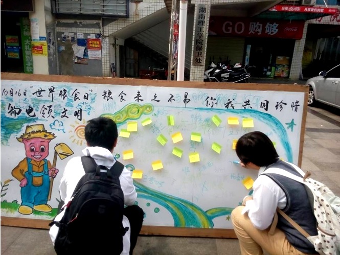 2014年10月16日,World Food Day。在第34个世界粮食日里物电学院学子发起了“爱粮节粮,争做“光盘”女神”为主题的系列教育实践活动。