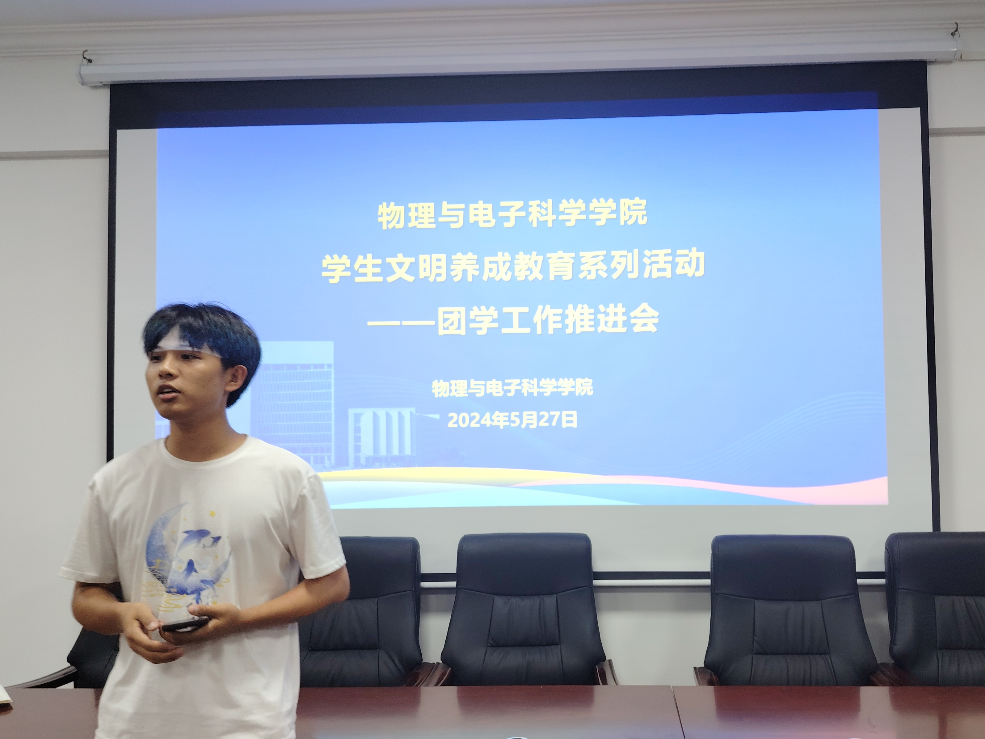 为了提高团学干部工作的积极性和主动性,5月27日晚上7:00,物电学院学生文明养成教育系列活动----团学工作推进会在6211召开。本次会议由学院党委副书记石红芳主持,学院团委书记姚世鹏、各班班委及团学分会成员参会。