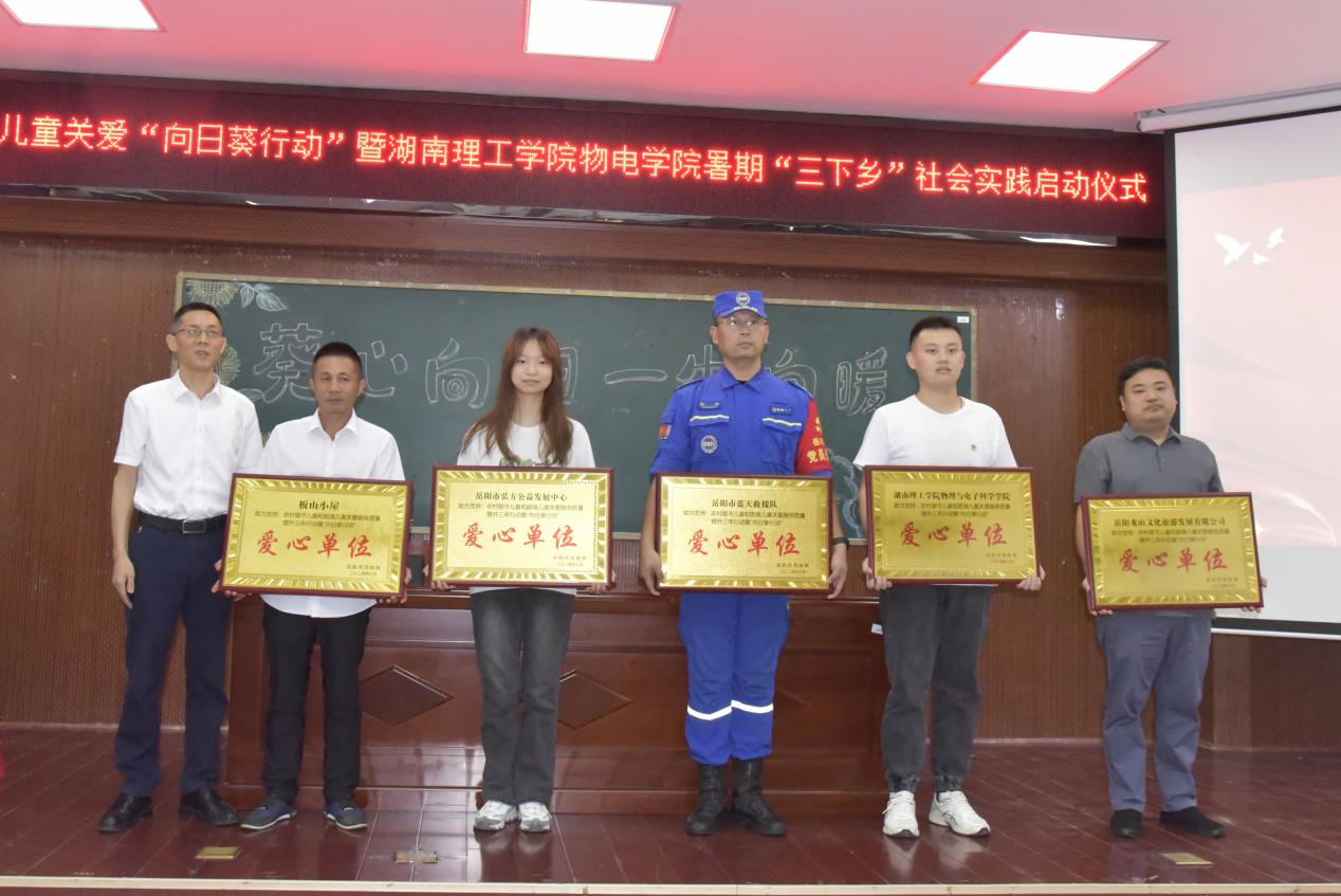 陈平刚为WilliamHill中文官方网站物电学院、岳阳市蓝天救援队、岳阳市弘方公益发展中心、岳阳市龙山文化旅游发展有限公司、板山小屋等五家“爱心单位”授予了“爱心单位”奖牌。