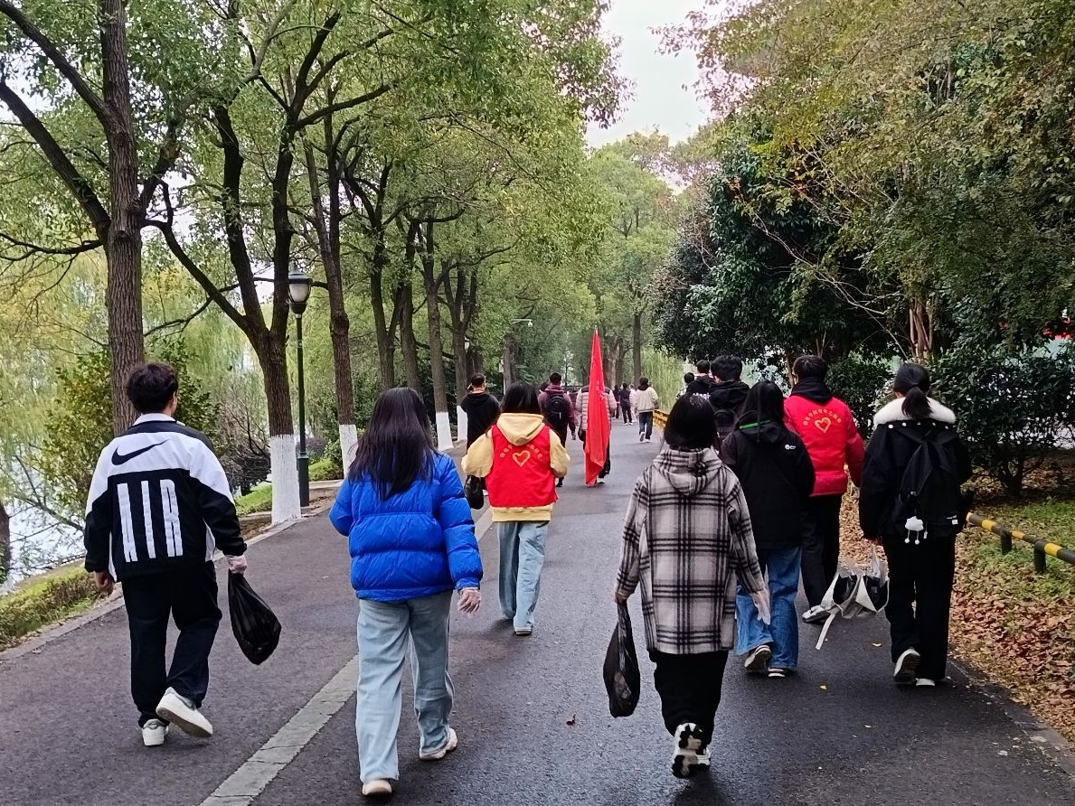 志愿者们从学院集合出发,沿着南湖绿道捡拾纸屑、塑料瓶,红马甲与红旗帜相辉映,成了秋雾里最鲜活的色彩,他们的足迹亦是青春在奉献和服务中成长的痕迹。