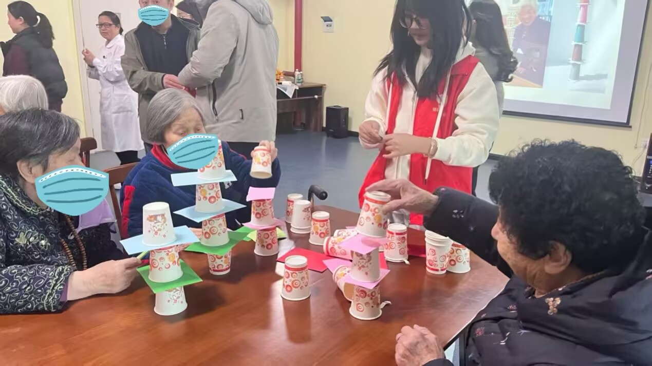 活动中,志愿者贴心陪伴长辈参与“纸杯叠叠乐”,耐心协助稳定杯塔、示范技巧;在“银杏叶变花”环节,手把手指导长辈卷叶制作,夸赞其作品精致;随后共唱《我只在乎你》,轻声引路、逐句提词,动情时挽手共舞。活动落幕,志愿者搀扶长辈离场、收好手作银杏花。