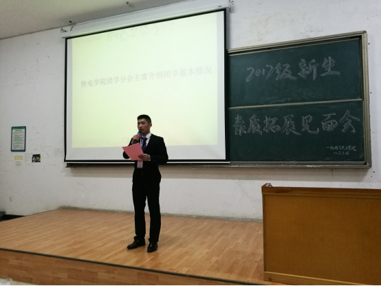 9月26日晚上7点,物电学院在7栋教学楼7T1教室举行17级新生素质拓展见面会。物电学院团总支书记张恒道、第八届团学分会全体委员以及17级全体同学参加了本次会议。