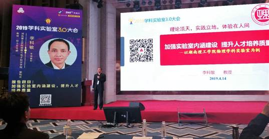 2019年2月12日-14日,全国2019学科实验室3.0大会在长沙市时代凯瑞酒店隆重召开,大会的主题是:探讨和交流新时代学科实验室建设的标准和经验,大会提出了学科实验室建设要做到“理论顶天,实践立地,体验在人间”的指导思想。有来自全国各省市大学、中小学和教育行政部门的600余名代表参加了这次盛会,我校物理与电子科学学院的李科敏教授应邀为本次大会做了题为《加强实验室内涵建设,提升人才培养质量》的主题报告,李教授从学科实验室建设的基本思路、具体做法、成果体现等三个方面,介绍了我校物理学科实验室建设的做法和经验,在参会代表中产生了强烈的影响,特别是我校物理学科实验室的自制物理教具,引起了参会代表的浓厚兴趣和极大关注。