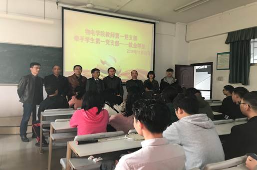 为落实国家就业帮扶政策,让毕业班的学生了解并积极参加2019 年 11 月 23 日在学校召开的“湘北地区 2020 届高校毕业生供需见面会”,11月22日下午,物电学院于6103教室举办教工第一、第二党支部牵手学生第一、第二党支部就业帮扶活动。物电学院党总支书记罗文华、院长李宏民、物电学院党总支副书记张陈武及全体教工党员出席此次活动,学生第一、第二党支部部分党员及就业困难毕业生参加。
