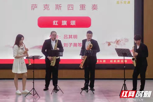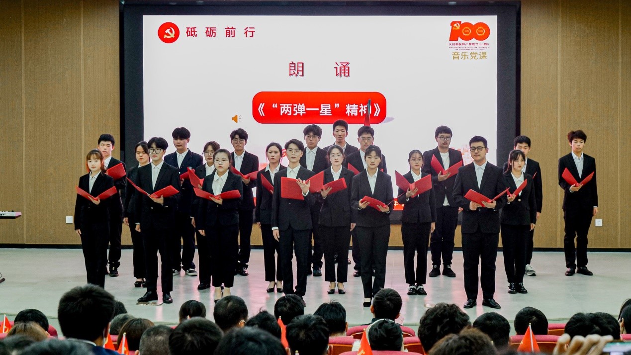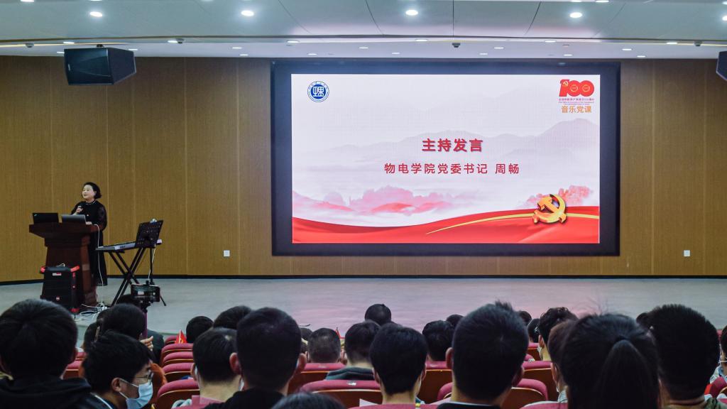 党课正式开始,黄皓华将党的百年历史分为“筚路蓝缕”“ 砥砺前行”“ 春潮澎湃”“ 走向复兴”四个阶段,深情讲述党在百年奋斗中哪些激情燃烧的岁月,通过音乐学院师生演绎的《浏阳河》《游击队之歌》《春天的故事》《我和我的祖国》《江山》一首首激扬的歌曲,物电学院学生朗诵的《“两弹一星”精神》等艺术形式,让我们重新定义时代强音。革命历史舞蹈,党史互动问答更是打造全新党课形式,在场党员和入党积极分子无不感受到其中坚定的信仰和信心,沉浸在这场音乐旅途中。