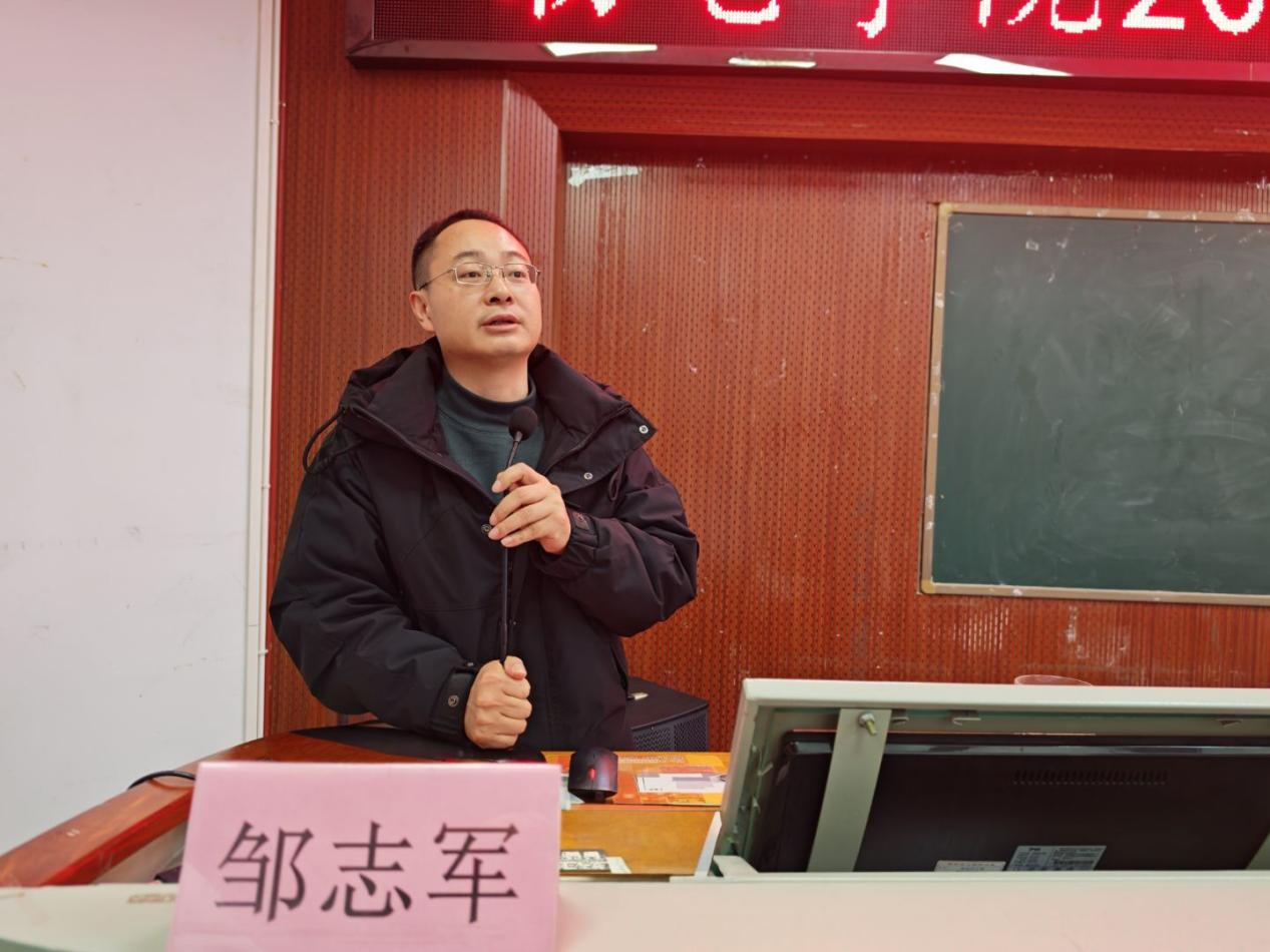 副院长邹志军讲解了考研复试与调剂等相关内容,他详细介绍了2025年学院考研报名情况及整体形势,指出部分专业报考扎堆现象明显,竞争压力加剧。他提醒毕业生既要正视挑战,也要坚定信心,科学规划复试策略,主动关注调剂信息,争取理想升学机会。