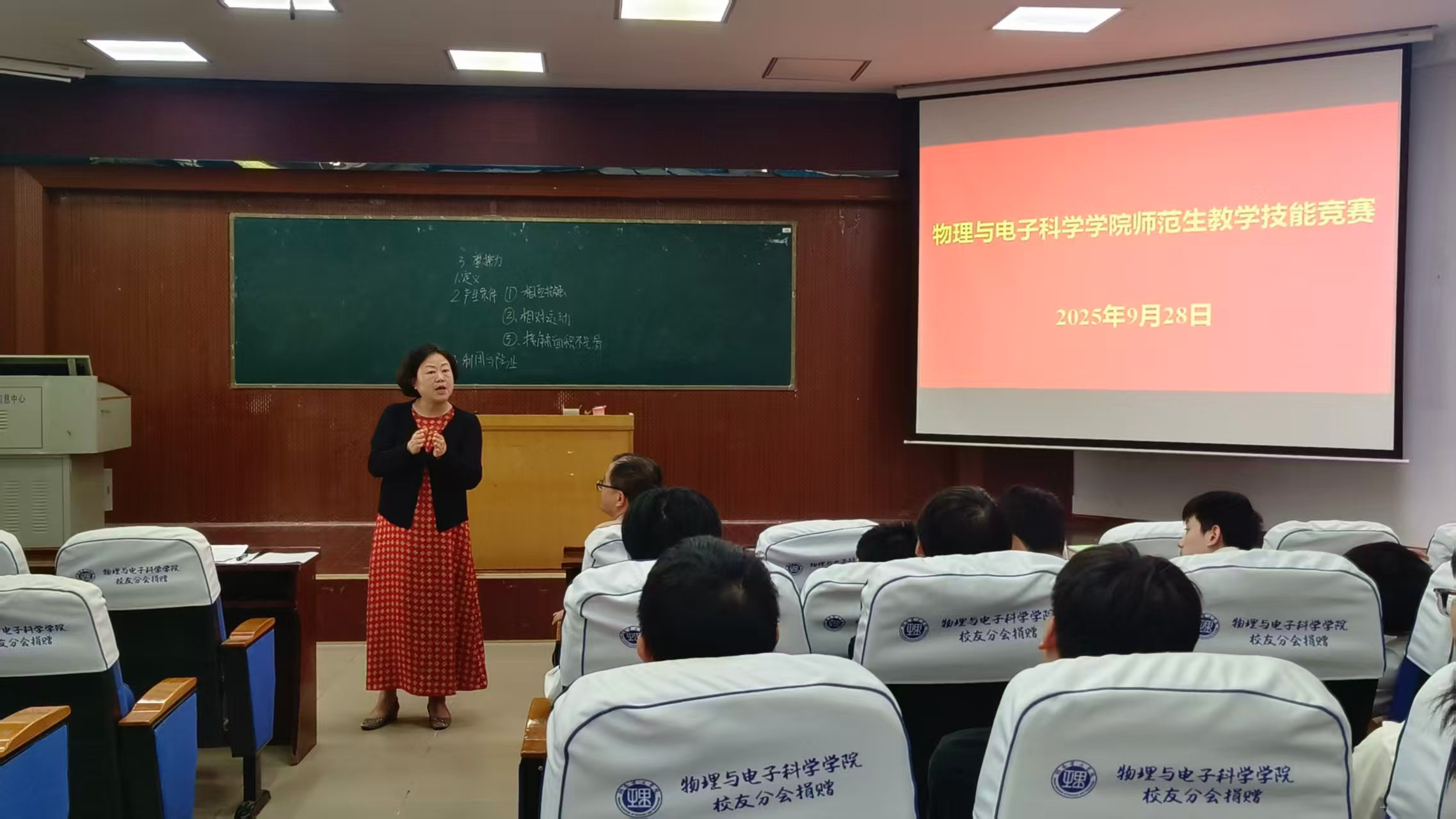 2025年9月28日,物理与电子科学学院师范生教学技能竞赛在南院6号楼学术报告厅举办,院党委书记周畅、院党委委员李科敏、物理学教研室主任李奇云担任评委。