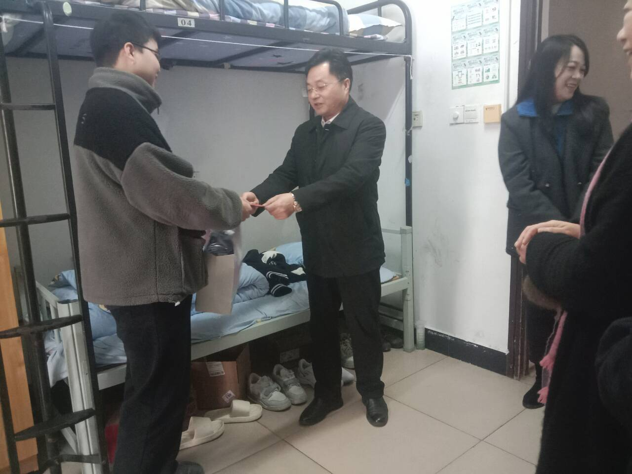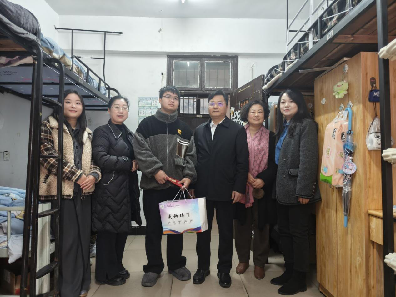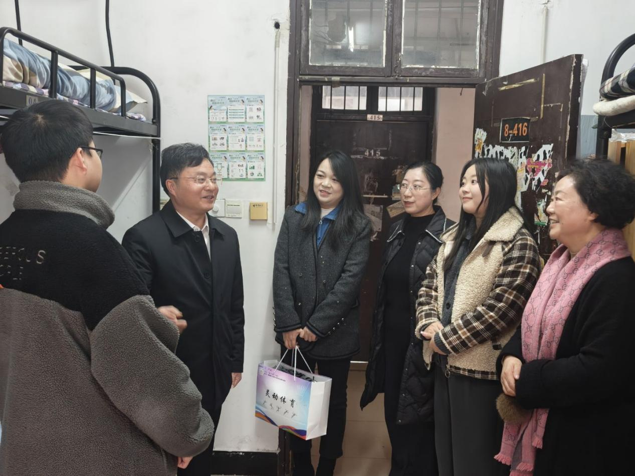 12月30日下午,副校长汤小红带队,校团委副书记彭璐、物电学院党委书记周畅、副书记石红芳及辅导员刘莹一行前往学生宿舍慰问学生。
