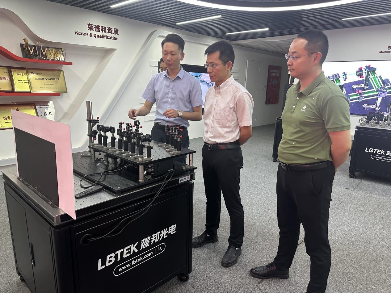 麓邦光电科技有限公司的业务板块负责人莫忠带领大家参观了麓邦光电的研发展厅、研发实验室和创新设计工作室,介绍了公司的领先技术,让大家了解到麓邦光电的团队情况、发展方向和领先科技,以及未来的相关规划。他强调,校企之间的紧密合作对于促进区域经济发展和人才培养具有不可或缺的作用。