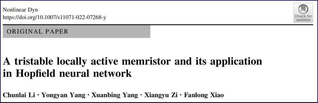 近期,李春来教授课题组在国际权威学术期刊《Nonlinear Dynamics》发表题为“三稳态局部有源忆阻器及其神经网络应用”(A tristable locally active memristor and its application in Hopfield neural network)的研究论文。论文第二作者杨永艳为我校信息与通信工程专业2019级硕士研究生。论文基本信息如图1。