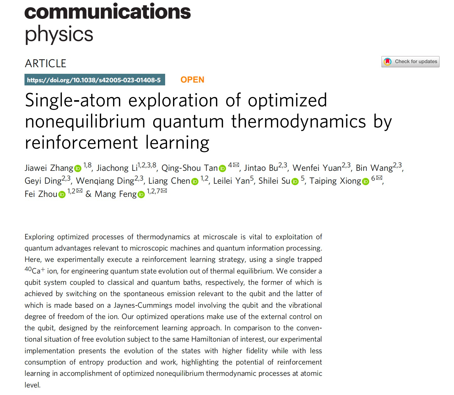 近日,物电学院谭庆收教授与广州工业技术研究院量子精密测量研究中心、中国科学院精密测量科学与技术创新研究院、郑州大学等研究机构合作, 在《自然》杂志的子刊《通讯-物理》(Communications Physics)上发表题为“Single-atom exploration of optimized nonequilibrium quantum thermodynamics by reinforcement learning”的学术论文。谭庆收教授为该论文的第一通讯作者。