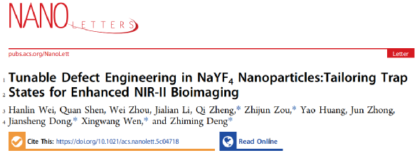 近日,我院光电材料与器件团队邓芝明博士联合湖南大学、中科院宁波材料所、吉首大学在物理学领域顶级期刊《Nano letters》(IF =9.1,DOI:10.1021/acs.nanolett.5c04718.)上发表了题为“Tunable Defect Engineering in NaYF4 Nanoparticles: Tailoring Trap States for Enhanced NIR-II Bioimaging”的研究论文,通过创新性缺陷工程策略,成功开发出具有三重近红外二区(NIR-II)发射峰的增强型荧光材料,为生物医学成像领域带来重大突破。