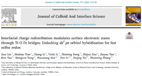 近期,我院光电材料与器件团队刘国博士联合兰州大学张振兴教授在材料科学领域学术期刊《Journal of Colloid and Interface Science》(中科院一区TOP,IF=9.7)发表题为“Interfacial charge redistribution modulates surface electronic states through Ti-O-Fe bridges: Unlocking dz2-pz orbital hybridization for fast sulfur redox”的研究论文,论文基本信息如图1所示。