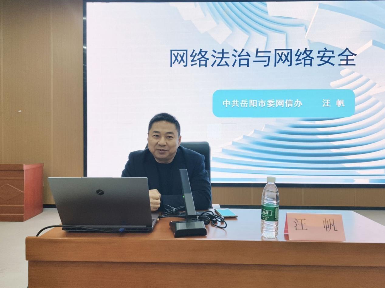 12月4日,物电学院在17118学术报告厅举办网络法治与网络安全讲座,岳阳市网信办汪帆科长受邀主讲,学院党委书记周畅、副书记石红芳、2024级辅导员李哲君出席,2025级辅导员刘莹主持,2025级本科生和研究生参与。