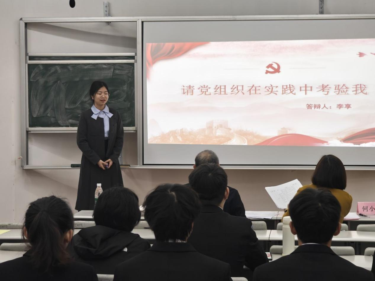 答辩会在庄严的国歌声中正式开始。27名入党积极分子依次围绕个人基本情况、入党动机、党性实践锻炼及对党的理论认识等方面进行5分钟陈述。评委根据答辩内容进行针对性提问,答辩人现场作答。每组同学完成答辩后,评委和现场人员为每位答辩人评分。