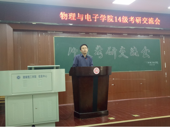 为了激发2018届学生的学习热情和考研激情,增强同学们的考研信心。5月5日下午3点,在物电楼学术报告厅举办了14级考研交流会。物电学院院长李宏民、党总支书记罗文华、4位13级考研成功的学生、14级学生代表刘妍及14级全体学生参加了此次交流会。