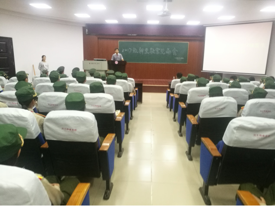 9月10日晚7点,物电学院17级新生教官见面会在6栋学术报告厅举行。岳阳武警支队的朱教官、潘教官,物电学院党总支副书记孙亚辉老师、17级辅导员何小娅老师以及各“军训助管”出席本次会议。