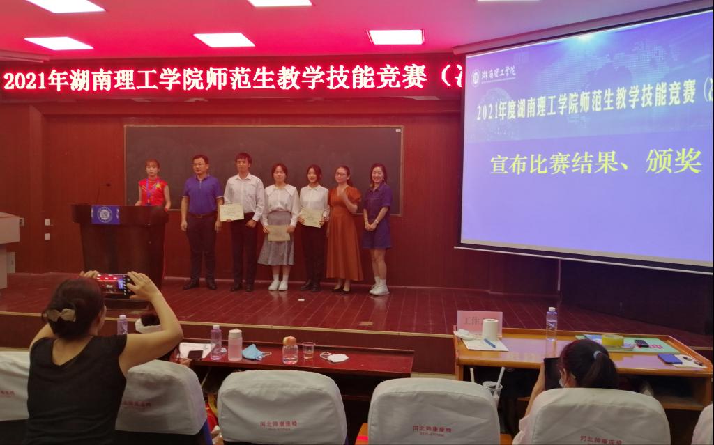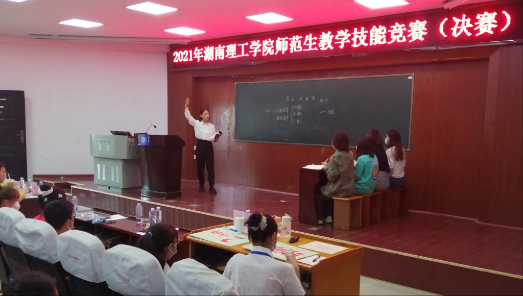 该项活动旨在进一步推动我校人才培养模式和实践教学的改革,加强我校教师教育专业学生职业技能的培养,提高师范生的教育教学能力,尽快适应基础教育改革发展对师资培养的需求。竞赛包含片段教学、教学板书、教育问答等环节,其中片段教学成绩占总成绩的70%,教学板书和教育问答各占总成绩的15%,综合考核参赛选手的教育教学实践与研究能力。经过近4个小时紧张而激烈的角逐,中文学院龚晓思、物电学院方君、外语学院徐雪荣获一等奖,并获得第七届湖南省普通高等学校师范生教学技能竞赛的参赛资格;化工学院周岚、政法学院彭婉瑜、美设学院呙迪、体育学院文永桂和数学学院侯露伟荣获二等奖,并获得第七届湖南省普通高等学校师范生教学技能竞赛的预参赛资格。