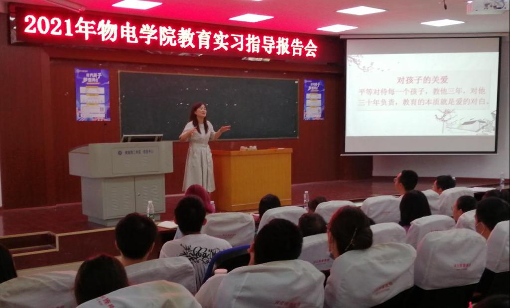 2021年9月17日上午,物理与电子科学学院在物电楼学术报告厅隆重举行教育实习指导报告会,副院长魏勇主持,副院长邹志军、李照宇、陈灏、李奇云等教师及各年级物理专业师范生200多人参加。来自实习基地学校的三位资深中学物理教师,针对中学物理教育教学、班级管理等方面,对我们的学生进行了悉心的教育和指导。
