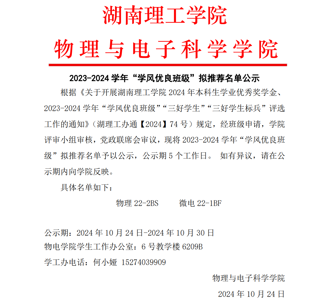 WilliamHill中文官方网站物理与电子科学学院 2023-2024 学年“学风优良班级”拟推荐名单公示