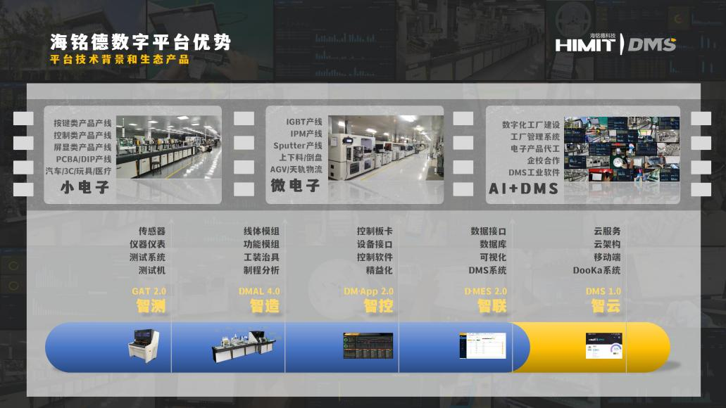 深圳市海铭德科技有限公司是一家全球化的集智测、智造、智控、智联、智云于一体的DMS(Digital Manufacturing Service)数字化工厂全解决方案提供商。公司为国家高新技术企业、“专精特新”企业、软件企业、智能制造示范企业。海铭德科技DMS核心技术为“AI+智能制造”,主要通过以下几个平台共同实现体现: