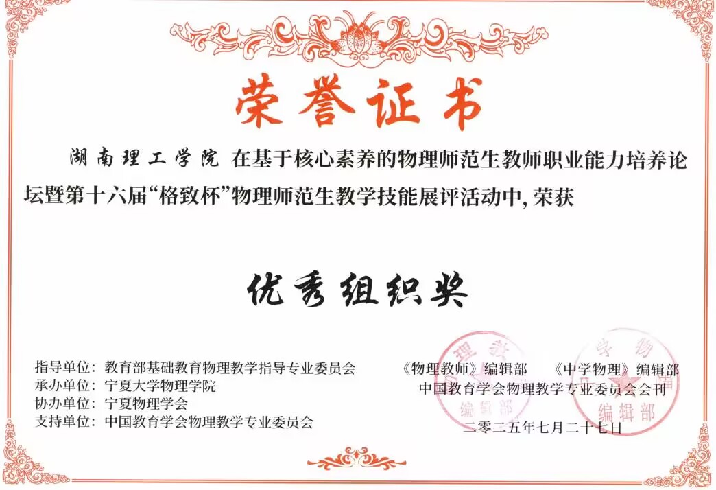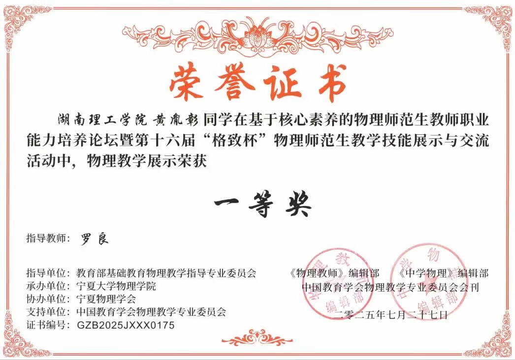 2025年7月,在第十六届“格致杯”物理师范生教学技能展评活动中,我院学子表现优异,WilliamHill中文官方网站荣获优秀组织奖,物理23-1BS班的黄胤彰同学荣获“物理教学展示”一等奖;物理22-1BS班的李志伟、符彬、陶铮同学和物理23-2BS班的方芳、黄胤彰、李敏佳同学,荣获“物理自制教具”一等奖;学科教学(物理)2024级研究生胡天路、彭颖、汤朗煊同学荣获“物理教学论文展示”一等奖;此外,物理22-2BS班的舒铄茹、李享同学,物理23-1BS班的李诗扬同学,物理23-2BS班的王秋怡同学,学科教学(物理)2024级研究生彭颖、胡天路等同学荣获“物理教学展示”二等奖,物理23-2BS班的廖艳虹同学荣获“物理教学展示”三等奖;物理22-2BS班的孙静怡、董心慈、李享同学,物理23-2的张雅卉同学荣获“物理自制教具”二等奖,李诗扬、彭颖、胡天路的物理教具荣获三等奖;黄胤彰、董心慈、侯心怡、曾家豪、彭颖、胡天路等人的物理教学论文荣获二等奖。