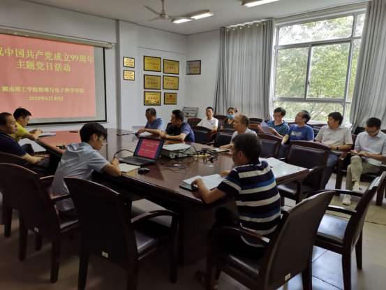 630日下午物电学院在6205会议室开展建党99周年主题党日活动,活动由物电学院分党委书记罗文华主持,物电学院分党委全体领导班子及教工党员参加本次活动