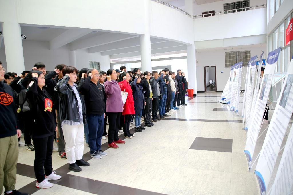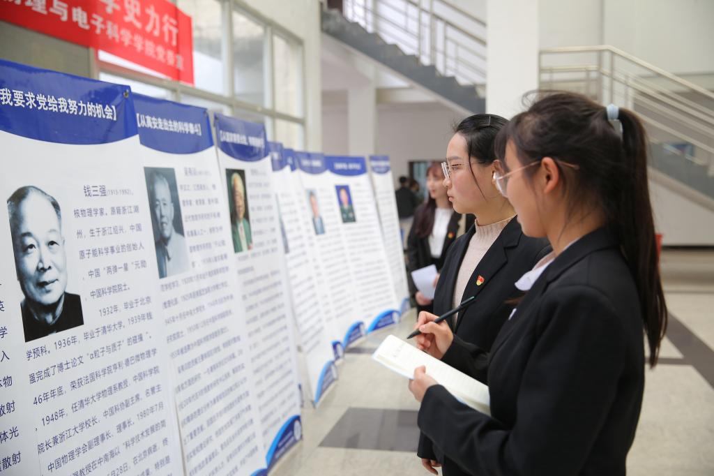 当天下午,物电学院召开“诵读科学故事 传承科学家精神”学党史主题活动及座谈会,物理学院党委书记罗文华,学生第一党支部书记何小娅及相关学员参与座谈。全体党史师生在爱国科学家展板前,重温入党誓词。