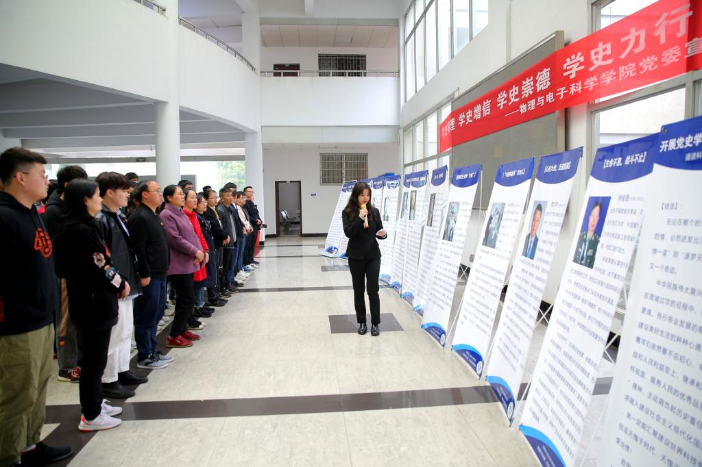 学院师生来到爱国科学家、爱国物理学家展板前了解他们为祖国发展无私奉献的科研工作经历以及爱国爱民的感人事迹。物电学院辅导员张庆喆表示,历史是最好的教科书,也是最好的清醒剂和营养剂。了解爱国科学家、爱国物理学家,从他们的经历中汲取智慧与力量,将党史学习教育融入高校学生的专业教育之中,充分发挥党史教育的立德树人价值,帮助学生树立正确的历史观。