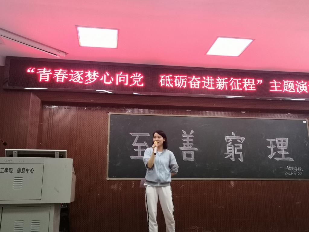 为献礼中国共产党成立100周年,展现物电学子向上向善的精神风貌,5月22日晚,物电学院于六栋学术报告厅举行了“青春逐梦心向党,砥砺奋进新征程”主题演讲比赛决赛。研究生辅导员许邕子老师、第十五届演讲比赛优秀选手彭惠和团学分会主席团部分成员及学习部部长担任此次比赛评委,19级、20级部分学生观赛,共计10名选手参赛。