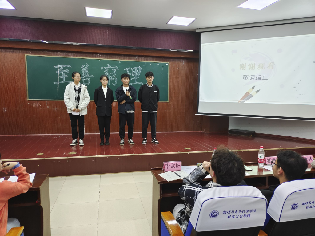 大赛开始,主持人介绍完相关情况后,各组参赛选手依次上台进行展示。他们结合PPT,从作品理念,创新思维,纪念意义及商业价值等方面对自己的作品做出详细介绍,并由各评委进行点评和提问。各组选手的设计品极具特色和内涵,集妙想与灵思于一体,体现了物电学子对学校深沉的爱。