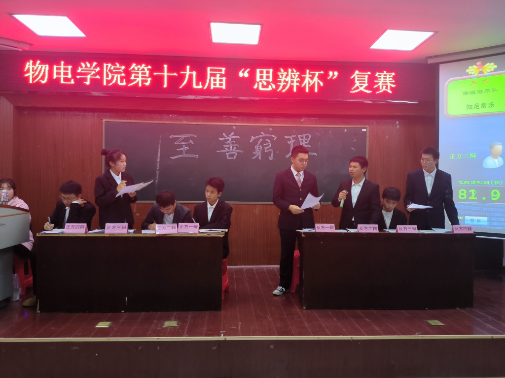 暗淡了刀光剑影,抡起了唇枪舌战。11月9日晚,物电学院第十九届“思辨杯”复赛于在学术报告厅顺利举行。此次比赛由物电团学分会学术科研部承办,特邀物电学院现辩论队教练阳佩,队长王嘉豪以及部分队员出任评委,初赛晋级四强队伍参赛。