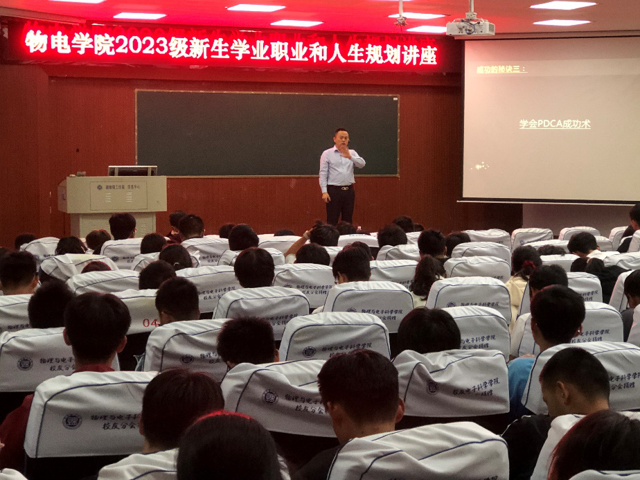 10月11日晚,物电学院在南院6号教学楼学术报告厅举行题为“做成功的自己”报告会。学院邀请湖南天欣集团总经理邓兵主讲,辅导员熊彦淇及全体2023级新生参加,院党委副书记李科敏主持。