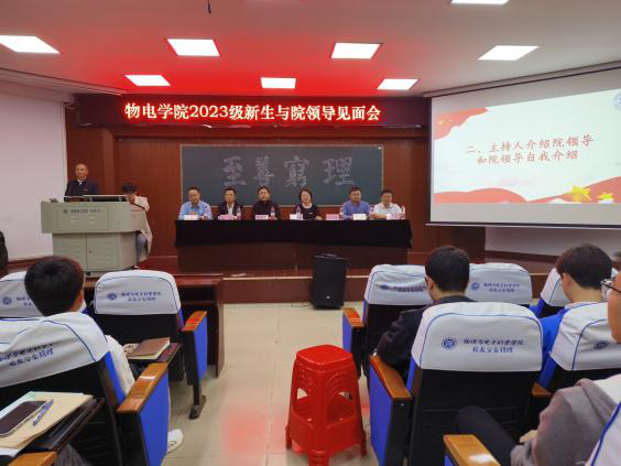 10月12日晚,物电学院在南院6号教学楼的学术报告厅召开2023级新生(含研究生)与院领导见面会。院党委书记周畅,党委副书记、院长李宏民,党委副书记李科敏,党委委员、副院长魏勇、罗良、邹志军,党委委员李昶及2023级新生辅导员、班主任代表熊彦淇、任年出席,全体新生参加。李科敏主持。