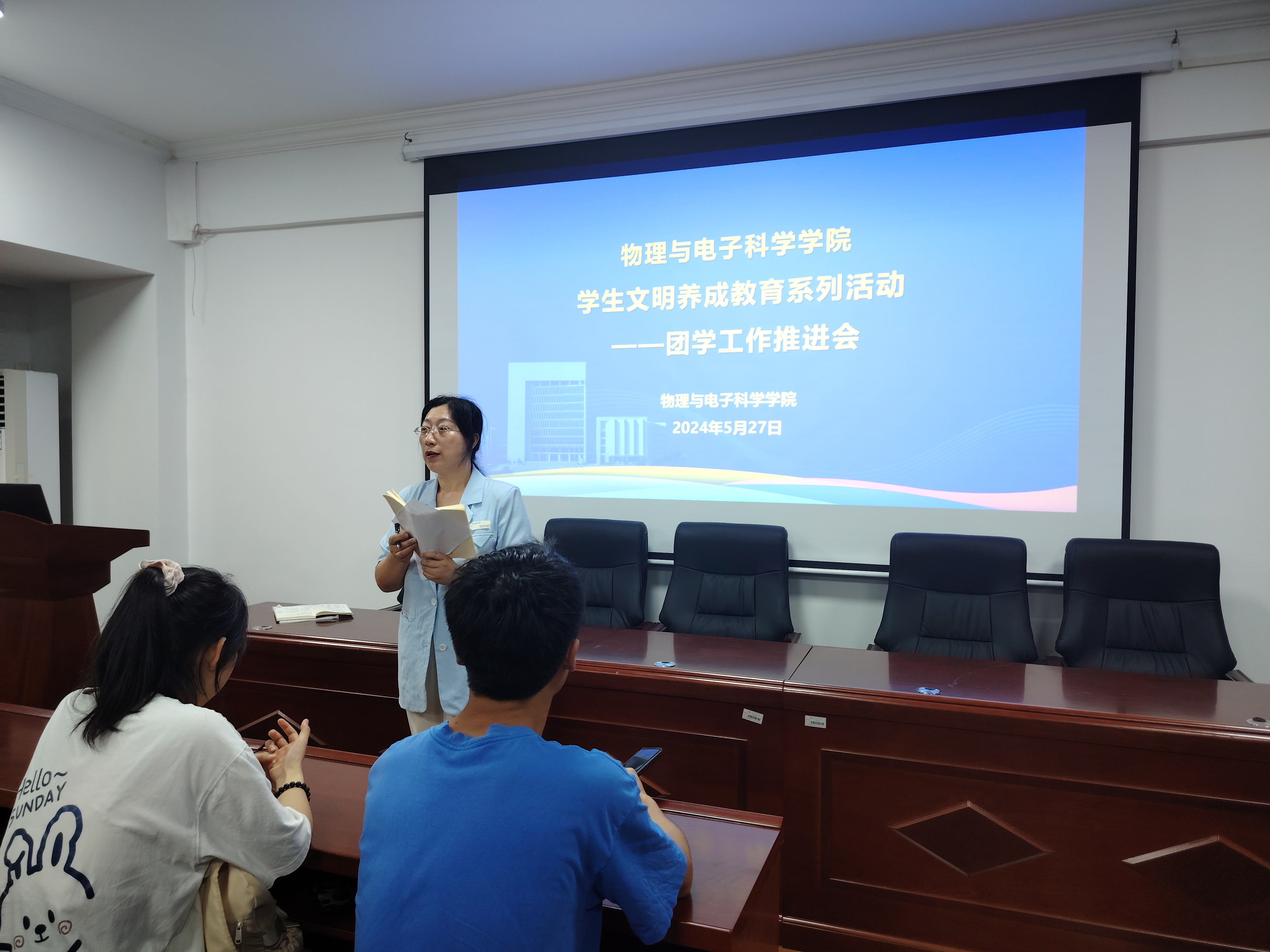 为了提高团学干部工作的积极性和主动性,5月27日晚上7:00,物电学院学生文明养成教育系列活动----团学工作推进会在6211召开。本次会议由学院党委副书记石红芳主持,学院团委书记姚世鹏、各班班委及团学分会成员参会。