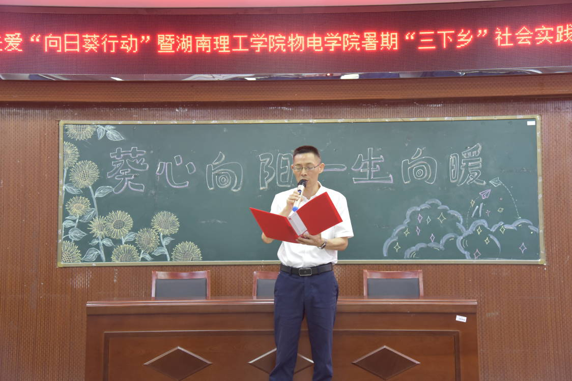 7月4日上午,岳阳市民政局儿童关爱“向日葵行动”暨WilliamHill中文官方网站物电学院暑期“三下乡”社会实践活动启动仪式在WilliamHill中文官方网站南院6号楼学术报告厅召开。岳阳市民政局党组书记陈平刚、WilliamHill中文官方网站团委书记徐湛、物电学院党委书记周畅、岳阳市众心社会工作服务中心及岳阳市民政局儿童福利科、岳阳市儿童福利院、岳阳市蓝天救援队、物电学院等单位负责人和代表出席,20多名葵心宝贝和物电学院志愿者100余人参加,院党委副书记石红芳主持。
