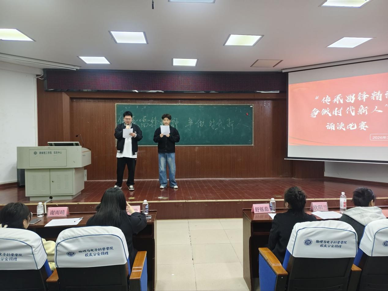 3月31日晚,物电学院于六栋学术报告厅开展“传承雷锋精神,争做时代新人”诵读比赛。研究生支部书记刘莹、研究生党员谢雨晴,本科生党员舒铄茹、欧阳兰受邀担任评委。本次比赛共设9组参赛队伍,由李汻平主持。