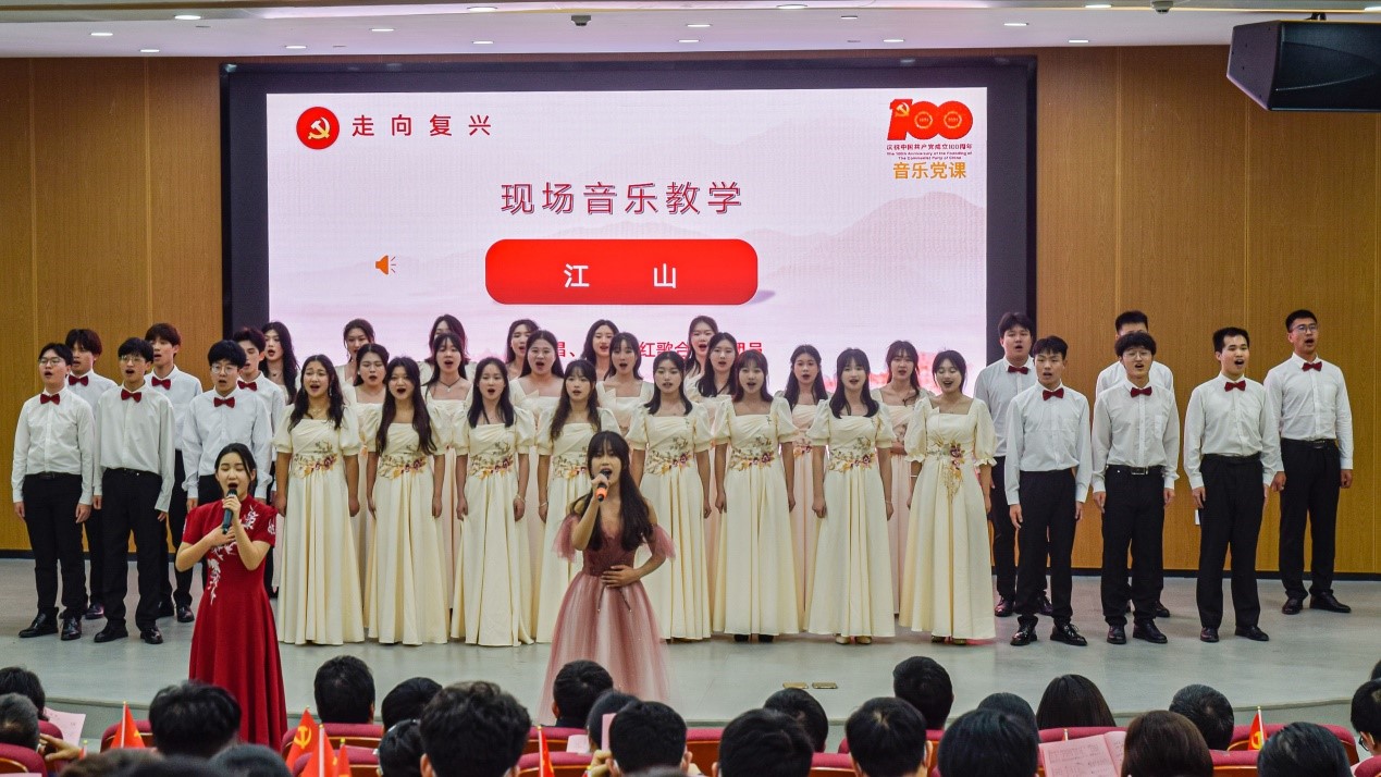 党课正式开始,黄皓华将党的百年历史分为“筚路蓝缕”“ 砥砺前行”“ 春潮澎湃”“ 走向复兴”四个阶段,深情讲述党在百年奋斗中哪些激情燃烧的岁月,通过音乐学院师生演绎的《浏阳河》《游击队之歌》《春天的故事》《我和我的祖国》《江山》一首首激扬的歌曲,物电学院学生朗诵的《“两弹一星”精神》等艺术形式,让我们重新定义时代强音。革命历史舞蹈,党史互动问答更是打造全新党课形式,在场党员和入党积极分子无不感受到其中坚定的信仰和信心,沉浸在这场音乐旅途中。