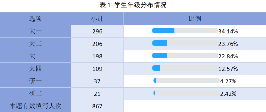 调查问卷向我院全体学生以及开设有《大学物理》课程的理工科学院学生发放,有17个问题,涉及理想信念、关爱学生、专业能力等方面,有正向和负面清单,三天共收集有效问卷867份。被调查学生中大一、大二、大三的学生合计占比超过80%,尤其是大一学生,占比超过1/3。